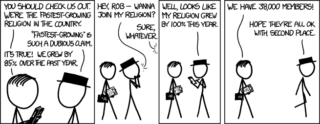 Der mange måder, men kan snyde gennem statistik, f.eks i et stik prøve deltager 20 personer, hvor 19 svarer “ja” (= 95% siger ja) Men en anden prøve er der samme spørgsmål til 1.000 personer og 950 svarer “ja” (= 95% også): gyldigheden af procentdelen er tydeligvis ikke den samme. At give kun procentdelen af ændringer uden det samlede antal eller stikprøvestørrelsen vil være helt vildledende. xkdcs tegneserie illustrerer dette meget godt for at vise, hvordan den “hurtigst voksende” påstand er en totalt relativ markedsføringstale: